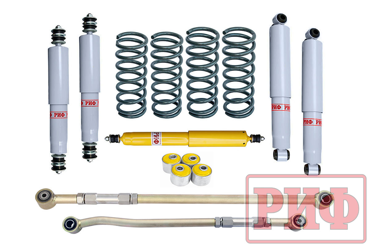Все компоненты лифт-комплектов РИФ разработаны специально для эксплуатации внедорожника в тяжелых условиях на различных дорожных покрытиях. Рессоры, амортизаторы с технологией Foam Cell и пружины РИФ не только компенсируют вес установленного на внедорожнике дополнительного оборудования (бамперов, порогов, дополнительных топливных баков, лебедок и прочего), но также существенно повышают грузоподъемность автомобиля. Удлиненные стремянки и серьги РИФ произведены из высококачественных материалов и имеют увеличенный запас прочности. Рессорные втулки РИФ изготовлены из полиуретана обладает высокой упругостью, износостойкостью и термоустойчивостью к высоким или низким температурам.