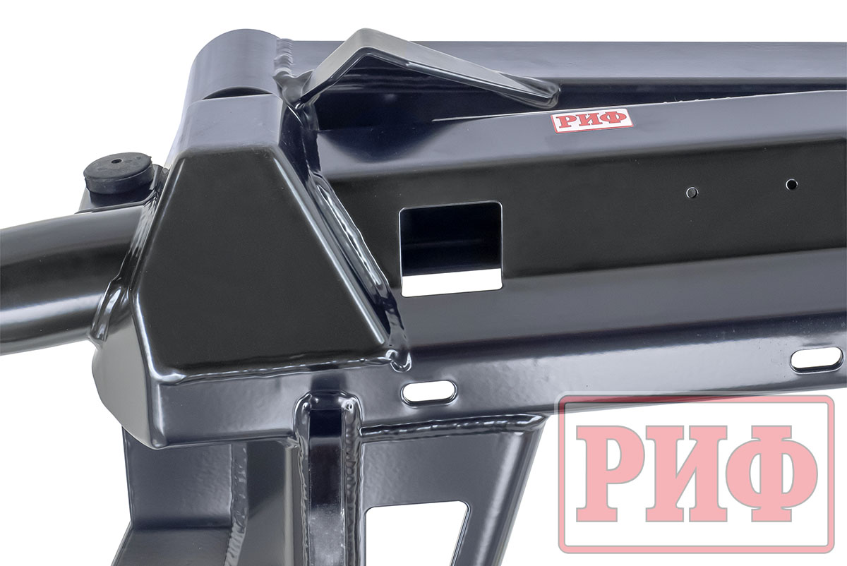 Задний силовой бампер РИФ надежно защитит кузов автомобиля на бездорожье или в городе в случае непредвиденных инцидентов. Бампер оборудован упорами под хай джек и буксирными проушинами для работы с рывковой или буксировочной стропой. Встроенный американский "квадрат" позволяет использовать любые съемные фаркопы, переходники, буксировочные устройства или съемные площадки для лебедки.